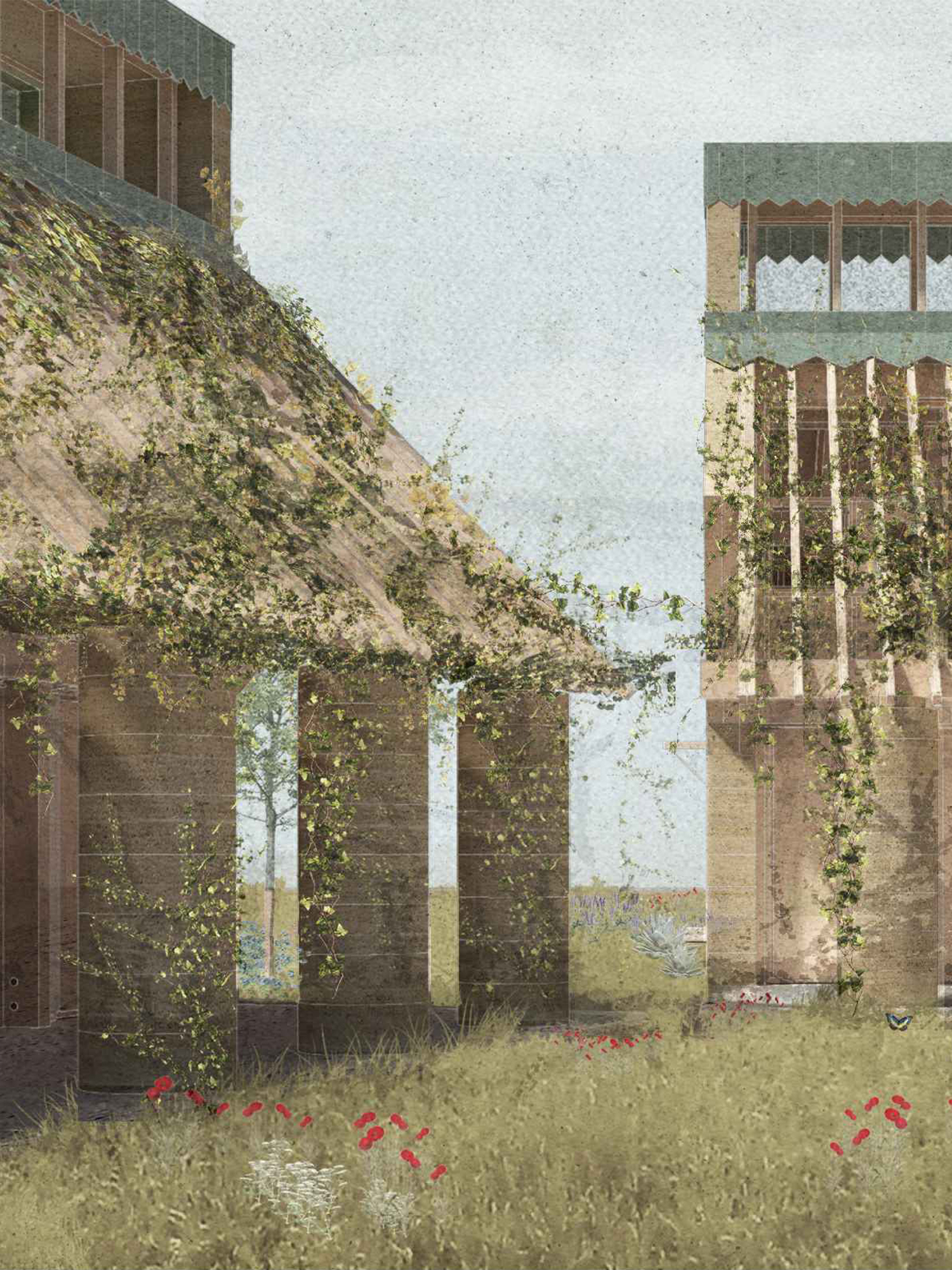 Herning sits one moraine hill with gravel, clay, and nutrient-poor soil. Located on urban fringe, the existing site consist mainly of fallow meadow with high groundwater levels. Frequent flooding limits accessibility to adjacent nature- and park area. The intervention introduces wooden boardwalks, enabling passage, to urban and recreational areas, while allowing natural flooding to persist. Respecting local land-use patterns, the project blends educational and residential functions with green spaces, integrating built and natural environments. With 41% built-up area, it provides housing for young artisans, workshop, and communal areas. Its flexible design ensures adaptability, evolving with occupants’ needs over time.